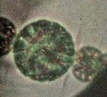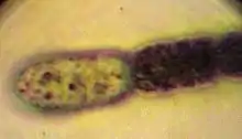 An akinete is an enveloped, thick-walled, non-motile, dormant cell formed by filamentous, heterocyst-forming cyanobacteria under the order Nostocales and Stigonematales.[1][2][3][4] Akinetes are resistant to cold and desiccation.[1] They also accumulate and store various essential material, both of which allows the akinete to serve as a survival structure for up to many years.[1][4] However, akinetes are not resistant to heat.[1] Akinetes usually develop in strings with each cell differentiating after another and this occurs next to heterocysts if they are present.[1] Development usually occurs during stationary phase and is triggered by unfavorable conditions such as insufficient light or nutrients, temperature, and saline levels in the environment.[1][4] Once conditions become more favorable for growth, the akinete can then germinate back into a vegetative cell.[5] Increased light intensity, nutrients availability, oxygen availability, and changes in salinity are important triggers for germination.[5] In comparison to vegetative cells, akinetes are generally larger.[4][6] This is associated with the accumulation of nucleic acids which is important for both dormancy and germination of the akinete.[6] Despite being a resting cell, it is still capable of some metabolic activities such as photosynthesis, protein synthesis, and carbon fixation, albeit at significantly lower levels.[3]
