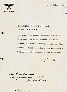 Aktion T4 (German, pronounced [akˈtsi̯oːn teː fiːɐ]) was a campaign of mass murder by involuntary euthanasia in Nazi Germany.[lower-alpha 2] The term was first used in post-war trials against doctors who had been involved in the killings.[4] The name T4 is an abbreviation of Tiergartenstraße 4, a street address of the Chancellery department set up in early 1940, in the Berlin borough of Tiergarten, which recruited and paid personnel associated with T4.[5][lower-alpha 3] Certain German physicians were authorised to select patients "deemed incurably sick, after most critical medical examination" and then administer to them a "mercy death" (Gnadentod).[7] In October 1939, Adolf Hitler signed a "euthanasia note", backdated to 1 September 1939, which authorised his physician Karl Brandt and Reichsleiter Philipp Bouhler to begin the killing.