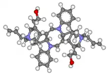 Alcuronium chloride is a neuromuscular blocking (NMB) agent, alternatively referred to as a skeletal muscle relaxant. It is a semi-synthetic substance prepared from C-toxiferine I,[1] a bis-quaternary alkaloid obtained from Strychnos toxifera. C-toxiferine I itself has been tested for its pharmacological action and noted to be a very long acting neuromuscular blocking agent[2] For a formal definition of the durations of actions associated with NMB agents, see page for gantacurium. The replacement of both the N-methyl groups with N-allyl moieties yielded N,N-diallyl-bis-nortoxiferine, now recognized as alcuronium (and at one time marketed as the proprietary agent called Alloferin).