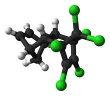 Aldrin is an organochlorine insecticide that was widely used until the 1990s, when it was banned in most countries. Aldrin is a member of the so-called "classic organochlorines" (COC) group of pesticides. COCs enjoyed a very sharp rise in popularity during and after The Second World War. Other noteworthy examples of COCs include DDT.[3] After research showed that organochlorines can be highly toxic to the ecosystem through bioaccumulation, most were banned from use. It is a colourless solid. Before the ban, it was heavily used as a pesticide to treat seed and soil. Aldrin and related "cyclodiene" pesticides (a term for pesticides derived from Hexachlorocyclopentadiene) became notorious as persistent organic pollutants.[4]