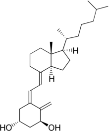Alfacalcidol has a weaker impact on calcium metabolism[3] and parathyroid hormone levels[4] than calcitriol, however alfacalcidol has significant effects on the immune system, including regulatory T cells.[5] It is considered to be a more useful form of vitamin D supplementation, mostly due to much longer half-life and lower kidney load.[6] It is the most commonly prescribed vitamin D metabolite for patients with end stage renal disease, given that impaired renal function alters the ability to carry out the second hydroxylation step required for the formation of the physiologically active form of vitamin D, 1,25-dihydroxyvitamin D3. Alfacalcidol is an active vitamin D3 metabolite, and therefore does not require the second hydroxylation step in the kidney.[7]