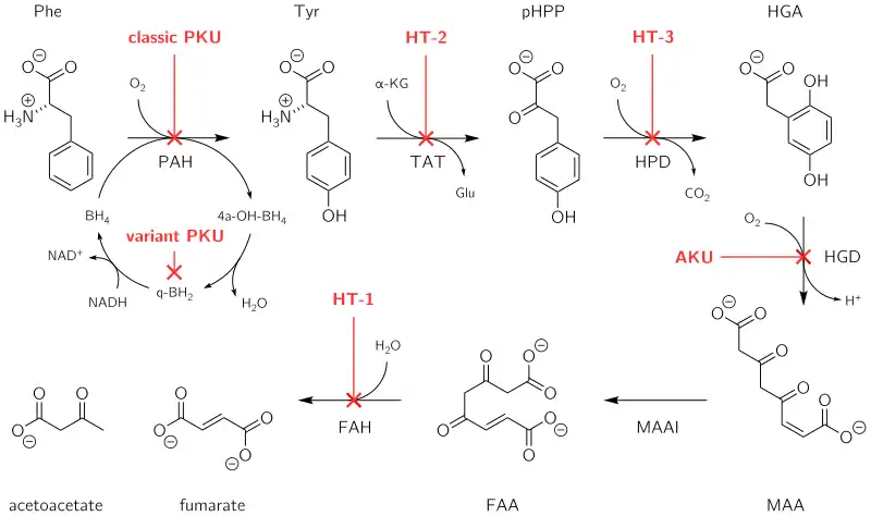 The HGD enzyme is involved in the metabolism (chemical processing) of the aromatic amino acids phenylalanine and tyrosine. Normally, these enter the bloodstream through protein-containing food and the natural turnover of protein in the body. Tyrosine is specifically required for a number of functions, such as hormones (e.g. thyroxine, the thyroid hormone), melanin (the dark pigment in the skin and hair), and certain proteins, but the vast majority (over 95%) is unused and is metabolized through a group of enzymes that eventually generate acetoacetate and malate.[1] In alkaptonuria, the HGD enzyme cannot metabolize the homogentisic acid (generated from tyrosine) into 4-maleylacetoacetate, and homogentisic acid levels in the blood are 100-fold higher than would normally be expected, despite the fact that a substantial amount is eliminated into the urine by the kidneys.[1]