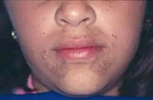 | Pigmentation of the face in alkaptonuria | |