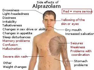 Common side effects include sleepiness, depression, headaches, feeling tired, dry mouth, and memory problems.[5] Some of the sedation and tiredness may improve within a few days.[10] Due to concerns about misuse, some do not recommend alprazolam as an initial treatment for panic disorder.[11] Withdrawal or rebound symptoms may occur if use is suddenly decreased;[5] gradually decreasing the dose over weeks or months may be required.[8] Other rare risks include suicide, possibly due to loss of inhibition.[12] Alprazolam, like other benzodiazepines, acts through the GABAA receptor.[5]