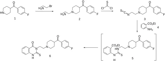 The sequence starts with the alkylation of pyrrolidine nitrogen in (1) with 2-bromoethylamine. Reaction of the primary amine in the product (2) with thiophosgene leads to the isothiocyanate derivative (3). Reaction of that reactive intermediate with methyl anthranilate (4) leads initially to the transient addition product (5). This then undergoes the customary internal ester exchange reaction to form the heterocyclic ring. There is thus obtained the serotonin antagonist altanserin (6).