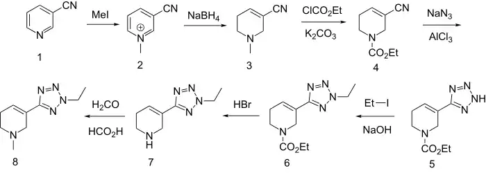 Alkylation of nicotinonitrile (accessible from nicotinamide)[4]) (1) with methyl iodide affords the N-methylpyridinium salt (2). Treatment of this intermediate with sodium borohydride reduces it to 3-cyano-N-methyl-1,2,5,6-tetrahydropyridine (3) in which the position of the double bond mimics that in arecoline. Reaction of (3) with ethyl chloroformate results in N-demethylation and consequent formation of the corresponding carbamate. The nitrile group is then transformed to a tetrazole by reaction with sodium azide in the presence of aluminum chloride, one of the standard procedures for building that ring. The surrogate acid is then alkylated with ethyl iodide to afford (6). Treatment with acid then removes the carbamate on the ring nitrogen (7) and the methyl group on the piperidine ring restored using formaldehyde and formic acid under standard Eschweiler–Clarke conditions, yielding the muscarinic agonist alvameline (8).[3]