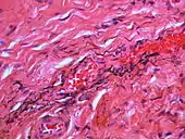 Over time, the amalgam particles embedded in the soft tissues corrode.[5]:183 Macrophages take up the exogenous particles, and the silver in amalgam leads to staining of collagen fibers.[5]:183