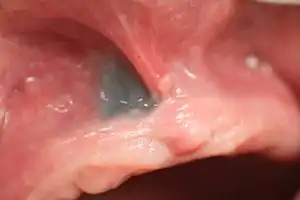 Amalgam tattoo usually occurs on the mandibular gingiva, often in an area in which an apicoectomy ("root-end filling") with amalgam was carried out.[3]:138 After the gingiva, the alveolar mucosa and the buccal mucosa are the next most common sites, although any mucosal site in the mouth is possible.[1] It is painless, and appears as a blue-black or grey discolored macule on the surface of the mucosa.[3]:138[4]:330[5]:183 The borders of the tattoo are variable, and may be well defined, irregular or diffuse.[1]