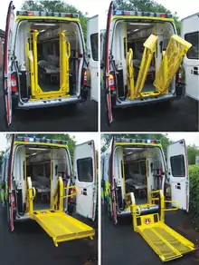 • Tail lift or ramp – Ambulances can be fitted with a tail lift or ramp in order to facilitate loading a patient without having to undertake any lifting. This is especially important where the patient is obese or specialty care transports that require large, bulky equipment such as a neonatal incubator or hospital beds. There may also be equipment linked to this such as winches which are designed to pull heavy patients into the vehicle.[52]
