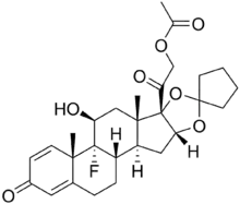 Amcinonide (trade name Cyclocort) is a topical glucocorticoid used to treat itching, redness and swelling associated with several dermatologic conditions such as atopic dermatitis and allergic contact dermatitis.[1][2] Amcinonide can also be classified as a multi-functional small molecule corticosteroid, which has been approved by the FDA and is currently marketed as an ointment, lotion, or cream.[3] It acts as both a transcription factor for responses to glucocorticoids and modulator for other transcription factors while also regulating phospholipase A2 activity.[4]
