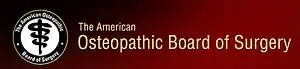 The American Osteopathic Board of Surgery (AOBS) is an organization that provides board certification to qualified Doctors of Osteopathic Medicine (D.O.) who specialize in the use of surgery to aid in the diagnosis and treatment of disease (surgeons). The board is one 18 medical specialty certifying boards of the American Osteopathic Association Bureau of Osteopathic Specialists approved by the American Osteopathic Association (AOA).[2] As of 2011, 1,279 osteopathic physicians held active certification with the AOBS.[3] The AOBS is one of two certifying boards for surgeons in the United States; the other certifying board is the American Board of Surgery of the American Board of Medical Specialties.[4] Fellows of the AOBS are eligible for full membership in major U.S. surgical societies such as the American College of Surgeons (ACS)[5] and the Society of Thoracic Surgeons.[6] Board certified surgeons of the AOBS are also eligible for membership in the American Society for Metabolic & Bariatric Surgery.[7]