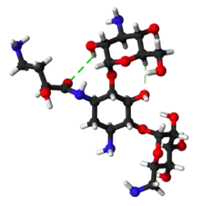 Amikacin evades attacks by all antibiotic-inactivating enzymes that are responsible for antibiotic resistance in bacteria, except for aminoacetyltransferase and nucleotidyltransferase.[25] This is accomplished by the L-hydroxyaminobuteroyl amide (L-HABA) moiety attached to N-1 (compare to kanamycin, which simply has a hydrogen), which blocks the access and decreases the affinity of aminoglycoside-inactivating enzymes.[25][26][27] Amikacin ends up with only one site where these enzymes can attack, while gentamicin and tobramycin have six.[11]