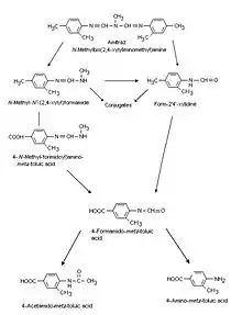 As illustrated in figure 3 the first step is a hydrolysis reaction to N-methyl-N'-(2,4-xylyl)-formamidine, which already can be excreted in the urine but is still pharmacological active.[20][21] Depending on the dose, the quantity of this metabolite in the urine can vary from 4% at low doses to 23%-38% at high doses (e.g. in case of rats: 1–100 mg per kg body weight).[20] As it isn't excreted it also can be oxidized to 4-N-Methyl-formidoyl)amino-meta-toluic acid, which can be further oxidized to 4-formamido-meta-toluic acid.[20] Form-2,4-xylidine is formed directly by hydrolysis from amitraz or arises from N-methyl- N'-(2,4-xylyl)formamidine.[21] During this early stage of biotransformation N-methyl- N'-(2,4-xylyl) formamidine and Form-2,4-xylidine may already form conjugates.[20] But the major route followed after the formation of Form-2,4-xylidine is the oxidation to 4-formamido-meta-toluic acid, which is further metabolized to its acetyl conjugate, 4-acetamido-meta-toluic acid or 4-amino- meta-toluic acid.[20][21] 4-formamido- meta-toluic acid and 4-acetamido- meta-toluic acid make 32% of the metabolites found in urine and are detected at any administered dose. Therefore, they are considered as two of the major metabolites in the amitraz pathway.[20] Form-2',4'-xylidide and 4-amino- meta-toluic acid account only for 2% of the total excretion.[20] In insects different metabolites are formed. N-methyl- N'-(2,4-xylyl)formamidine, Form-2,4-xylidine and 4-Amino-meta-toluic acid occur, but in addition several unidentified metabolites were detected, too.[21]