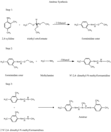 One of the first amitraz-manufacturing plants used this reaction scheme (figure 1).[5] Therefore, the reactions has been carried out in an enclosed area, to recycle unused reagents.[5] The first step of this route is the reaction of an aniline with triethyl orthoformate. In the named manufacturing plant 2,4-Xylidine has been used as the aniline.[7] The reaction yields an intermediate formimidate ester.[5][7] In the next step methylamine is added, which combines with the formimidate ester to yield the desired formamidine.[5][7] As the formamidines forms, ethanol is set free from the chemical reaction and is recycled.[5] This is probably the most suitable method for the synthesis of amitraz, because this second step yields N-2,4-dimethyl-N-methylformamidine. The free -NH groups of these molecules react with each other to finally yield amitraz.[5] The last steps of the manufacturing process include cristalisation out from isopropyl alcohol, filtering and drying. These last steps need to be carried out by instructed personnel, who wear full protective clothing with a positive-pressure breathing apparatus.[5][7]