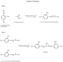 The first step of this synthesis route to an N-arylformamidine as amitraz is the reaction of a substituted formamide, usually a dialkylformamide, with an aniline.[6] To gain amitraz N-methyl formamide and 2,4 dimethyl aniline hydrochloride can be used (figure 2). This reaction is catalyzed by the presence of acid halides, such as POCl3, SOCl2, COCl2, or an arylsulfonylhalide, as p-toluene sulfonyl chloride (figure 2).[7][18] This yields an intermediate, which reacts further as its catalyzed by p-toluene acid to N, N'-[(methylimino) dimethylidyne] di-2,4-xylidine (amitraz).[18] Alternatively, the aniline in the first step can be replaced by an arylformamide. In addition the replacement of the dialkylformamide with an N-alkylpyrrolidone can be used to obtain products of the clenpyrin group from this reaction.[7]