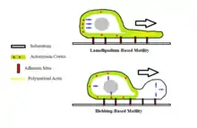 Cells may undergo fast transitions between blebbing and lamellipodium-based motility as a means of migration. However, the rate at which these transitions are made is still unknown. Tumor cells may also exhibit rapid transitions between amoeboid motility and mesenchymal motility, another form of cellular movement.[10]