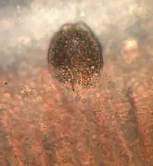 The parasitic stage is represented by the sessile trophont. In this phase, the protist is pear-shaped, enclosed in a cellulose wall and exhibits specific structures, rhizoids (tentacle like processes) that enable it to strictly anchor to host epithelia (gill or skin predominantly). If the infection is severe, trophonts can also be found on eyes, fins and in all oropharyngeal cavity, the latter is a typical infection site in the European seabass (Dicentrarchus labrax). Constantly moving while anchored and therefore causing physical injuries to cells, trophonts inflict serious damages to the host, potentially inducing its death in 12-48 hours as a function of the parasite burden. Based on data in the literature, the trophont feeds directly from the host cells, probably using the stomopode by releasing digestive enzymes,[3] which exacerbate the rhizoid lesions. Trophont size can vary considerably, with early trophonts measuring 27×23 µm while mature ones can reach up to 130×60 µm and more.
