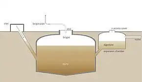 Schematic of an anaerobic digester as part of a sanitation system. It produces a digested slurry (digestate) that can be used as a fertilizer, and biogas that can be used for energy.[67]