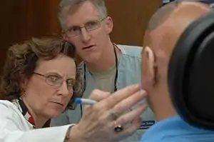 In the Battle of the Somme, an estimated 4,000,000 shots were fired, causing 20,000 facial injuries.[1] Individuals whose injuries were unable to be treated with plastic surgery or reconstructive surgery techniques available to them at the time were given the option of wearing customized pieces to restore the natural appearance of their face. These pieces were crafted by sculptors. A notable sculptor who created prosthetic pieces for victims of war was Anna Coleman Ladd, a member of the Red Cross who made casts of her patients' faces and then, by hand, would create pieces out of galvanized copper, tin foil, and human hair for them to wear.[2][3] Ladd's pieces were secured with bands around the head, which were often concealed by false eyeglasses.