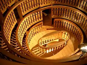 In origin, the theatre was built on two overlapping floors, and the entrance was on the first one, which was an open gallery. In 1822, the first intervention involved the building of a new room and the endowment of a new equipment.[19] In the same period, renovations concerned also the construction of a different roof with a five-meters skylight, in order to adapt the room to daylight. In fact, previously the theatre was not enlightened by the eight windows on the walls, because of the numerous flights of stairs that obscured the sunlight.