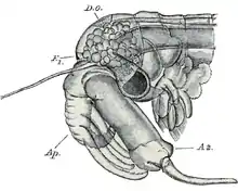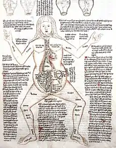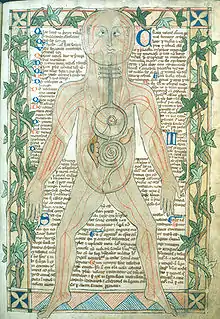 Some of the most striking advances in early anatomy and physiology took place in Hellenistic Alexandria.[54] Two of the most famous anatomists and physiologists of the third century were Herophilus and Erasistratus. These two physicians helped pioneer human dissection for medical research. They also conducted vivisections on the cadavers of condemned criminals, which was considered taboo until the Renaissance—Herophilus was recognized as the first person to perform systematic dissections.[55] Herophilus became known for his anatomical works making impressing contributions to many branches of anatomy and many other aspects of medicine.[56] Some of the works included classifying the system of the pulse, the discovery that human arteries had thicker walls than veins, and that the atria were parts of the heart. Herophilus's knowledge of the human body has provided vital input towards understanding the brain, eye, liver, reproductive organs and nervous system, and characterizing the course of disease.[57] Erasistratus accurately described the structure of the brain, including the cavities and membranes, and made a distinction between its cerebrum and cerebellum[58] During his study in Alexandria, Erasistratus was particularly concerned with studies of the circulatory and nervous systems. He was able to distinguish the sensory and the motor nerves in the human body and believed that air entered the lungs and heart, which was then carried throughout the body. His distinction between the arteries and veins—the arteries carrying the air through the body, while the veins carried the blood from the heart was a great anatomical discovery. Erasistratus was also responsible for naming and describing the function of the epiglottis and the valves of the heart, including the tricuspid.[59] During the third century, Greek physicians were able to differentiate nerves from blood vessels and tendons[60] and to realize that the nerves convey neural impulses.[54] It was Herophilus who made the point that damage to motor nerves induced paralysis.[61] Herophilus named the meninges and ventricles in the brain, appreciated the division between cerebellum and cerebrum and recognized that the brain was the "seat of intellect" and not a "cooling chamber" as propounded by Aristotle[62] Herophilus is also credited with describing the optic, oculomotor, motor division of the trigeminal, facial, vestibulocochlear and hypoglossal nerves.[63]