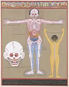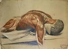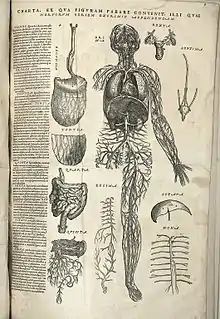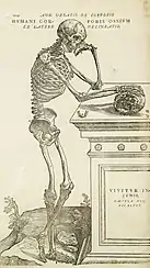 Andreas Vesalius (1514–1564) (Latinized from Andries van Wezel), professor of anatomy at the University of Padua, is considered the founder of modern human anatomy.[75] Originally from Brabant, Vesalius published the influential book De humani corporis fabrica ("the structure of the human body"), a large format book in seven volumes, in 1543.[76] The accurate and intricately detailed illustrations, often in allegorical poses against Italianate landscapes, are thought to have been made by the artist Jan van Calcar, a pupil of Titian.[77]