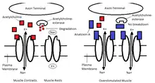 In normal circumstances, acetylcholine binds to nAchRs in the post-synaptic neuronal membrane, causing a conformational change in the extracellular domain of the receptor which in turn opens the channel pore. This allows Na+ and Ca2+ ions to move into the neuron, causing cell depolarization and inducing the generation of action potentials, which allows for muscle contraction. The acetylcholine neurotransmitter then dissociates from the nAchR, where it is rapidly cleaved into acetate and choline by acetylcholinesterase.[21]
