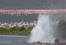 A particularly interesting case of anatoxin-a poisoning is that of lesser flamingos at Lake Bogoria in Kenya. The cyanotoxin, which was identified in the stomachs and fecal pellets of the birds, killed roughly 30,000 flamingos in the second half of 1999, and continues to cause mass fatalities annually, devastating the flamingo population. The toxin is introduced into the birds via water contaminated with cyanobacterial mat communities that arise from the hot springs in the lake bed.[25]