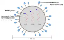 The spherical virion of the Hantavirus is typically 80-120 nm long and contains the segmented single-stranded genome.[11] The tri-segmented genome includes a S (small), M (medium), and L (large) segment that code for nucleocapsid (N), glycoproteins G1 and G2, and L protein respectively.[9] The S segment of the Andes virus contains 1876 nucleotides in total, while encoding a 547 nucleotide-long N protein.[12] Upon comparison of S and M segments to other variants, the Andes virus was found to form a lineage with viruses such as ESQ H-1/96, CH H-1/96 Bayou, and Black Creek Canal viruses.[12] When expressed, the M segment generates the glycoprotein precursor (GPC) which can be cleaved into the envelope Gn and Gc proteins.[13] The L protein encoded by the L segment possesses enzymatic functions that are involved within transcription and replication.[13]