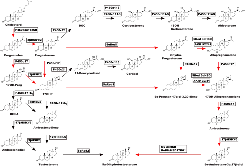 Therefore, the pathway can be outlined as 17-OHP → 5α-pregnan-17α-ol-3,20-dione → 5α-pregnane-3α,17α-diol-20-one → androsterone → androstanediol → DHT.[16]