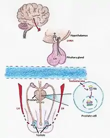 The synthesis of testosterone is mediated by a chain of processes that start in our brain. When our body detects a low level of testosterone, the hypothalamus starts to produce LHRH, a hormone which, once is received by the pituitary gland activates the synthesis of LH (Luteinizing hormone). LH travels to the testicles where it induces the formation of testosterone.[10] There are two methods of androgen deprivation therapy based on drugs. One works preventing the pituitary gland from releasing LH and the other one blocks the body’s ability to use androgens.