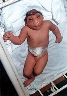 Anencephaly is the absence of a major portion of the brain, skull, and scalp that occurs during embryonic development.[1] It is a cephalic disorder that results from a neural tube defect that occurs when the rostral (head) end of the neural tube fails to close, usually between the 23rd and 26th day following conception.[2] Strictly speaking, the Greek term translates as "without a brain" (or totally lacking the inside part of the head), but it is accepted that children born with this disorder usually only lack a telencephalon,[3] the largest part of the brain consisting mainly of the cerebral hemispheres, including the neocortex, which is responsible for cognition. The remaining structure is usually covered only by a thin layer of membrane—skin, bone, meninges, etc. are all lacking.[4] With very few exceptions,[5] infants with this disorder do not survive longer than a few hours or possibly days after their birth.
