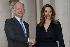Jolie has fronted a campaign against sexual violence in military conflict zones by the UK government, which made the issue a priority of its 2013 G8 presidency. In May 2012, she launched the Preventing Sexual Violence Initiative (PSVI) with Foreign Secretary William Hague,[164] who was inspired to campaign on the issue by her Bosnian war drama In the Land of Blood and Honey (2011).[165] PSVI was established to complement wider UK government work by raising awareness and promoting international co-operation.[164] Jolie spoke on the subject at the G8 foreign ministers meeting,[166] where the attending nations adopted a historic declaration,[164] and before the UN security council, which responded by adopting its broadest resolution on the issue to date.[167] In June 2014, she co-chaired the four-day Global Summit to End Sexual Violence in Conflict, the largest-ever meeting on the subject,[168] which resulted in a protocol endorsed by 151 nations.[169]