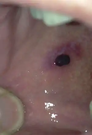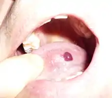 Angina bullosa haemorrhagica is a condition of the mucous membranes characterized by the sudden appearance of one or more blood blisters within the oral cavity.[1]:808 The lesions, which may be caused by mild trauma to the mouth tissues such as hot foods, typically rupture quickly and heal without scarring or further discomfort.[2] The condition is not serious except in rare cases where a large bulla that does not rupture spontaneously may cause airway obstruction.