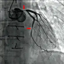 Coronary angiography of a critical sub-occlusion of the common trunk of the left coronary artery and the circumflex artery. (See arrows)