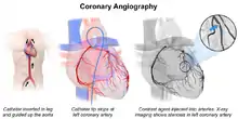 CT angiography can act as a less invasive alternative to Catheter angiography. Instead of a catheter being inserted into a vein or artery, CT angiography involves only the injection of a CT-visible dye into the arm or hand via an IV line. CT angiography lowers the risk of arterial perforation and catheter site infection. It provides 3D images that can be studied on computer, and also allows measurement of heart ventricle size. Infarct area and arterial calcium can also be observed (however those require a somewhat higher radiation exposure). That said, one advantage retained by Catheter angiography is the ability of the physician to perform procedure such as balloon angioplasty or insertion of a stent to improve blood flow to the artery.[7]