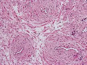 | Angioleiomyoma, smooth muscles encircling dilatated blood vessels | |