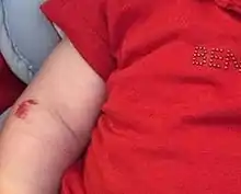 An infantile haemangioma, also called a strawberry angioma, on a child's arm
