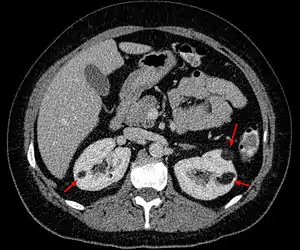 | Angiomyolipoma in both kidneys (arrows) in computer tomography. The tumours are hypodense (dark) due to fat content | |