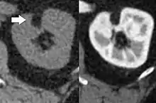 Three methods of scanning can detect Angiomyolipomas: ultrasound, computed tomography (CT), and magnetic resonance imaging (MRI).[5] Ultrasound is standard and is particularly sensitive to the fat in Angiomyolipomas, but less so to the solid components. However, accurate measurements are hard to make with ultrasound, particularly if the Angiomyolipoma is near the surface of the kidney (grade III).[4] CT is very detailed and fast, and allows accurate measurement. However, it exposes the patient to radiation and the dangers that a contrast dye used to aid the scanning may itself harm the kidneys. MRI is safer than CT, but many patients (particularly those with the learning difficulties or behavioural problems found in tuberous sclerosis) require sedation or general anaesthesia, and the scan cannot be performed quickly.[3] Some other kidney tumours contain fat, so the presence of fat is not diagnostic. Distinguishing a fat-poor angiomyolipoma from a renal cell carcinoma (RCC) can be difficult.[6] Both minimal fat AMLs and 80% of the clear-cell type of RCCs display signal drop on an out-of-phase MRI sequence compared to in-phase.[7] Thus, a lesion growing at greater than 5 mm per year may warrant a biopsy for diagnosis.[3]