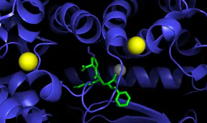 ACE is a zinc metalloproteinase.[16] The zinc ion is essential to its activity, since it directly participates in the catalysis of the peptide hydrolysis. Therefore, ACE can be inhibited by metal-chelating agents.[17]