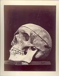 1870s American male skull. The angle of the mandible is visible just above the white number.