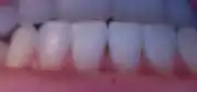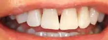 Angularis nigra, Latin for 'black angle', also known as open gingival embrasures, and colloquially known as "black triangle", is the space or gap seen at the cervical embrasure, below the contact point of some teeth. The interdental papilla does not fully enclose the space, leading to an aperture between adjacent teeth.[1] This gap has many causes including gingival recession, and gingival withdrawal post-orthodontic work.[2] Interdental "black triangles" were rated as the third-most-disliked aesthetic problem below caries and crown margins.[3] Treatment of angularis nigra often requires an interdisciplinary approach, involving periodontal, orthodontic and restorative treatment. Possible treatments to correct angularis nigra include addition of composite resin in the space,[4] veneer placement, or gum graft.[5] Angularis nigra is generally only treated based on the aesthetic preference of the patient[6] (although serious gum recession may warrant periodontal treatment).