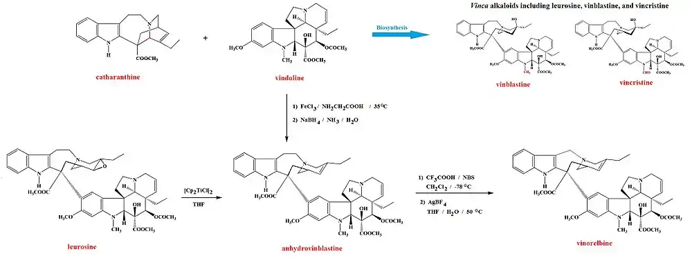 The Madagascan periwinkle Catharanthus roseus L. is the source for a number of important natural products, including catharanthine and vindoline[10] and the vinca alkaloids it produces from them: leurosine and the chemotherapy agents vinblastine and vincristine, all of which can be obtained from the plant.[11][12][5][13] The newer semi-synthetic chemotherapeutic agent vinorelbine, which is used in the treatment of non-small-cell lung cancer[5][6] and is not known to occur naturally. However, it can be prepared either from vindoline and catharanthine[5][14] or from leurosine,[15] in both cases by synthesis of anhydrovinblastine. The leurosine pathway uses the Nugent–RajanBabu reagent in a highly chemoselective de-oxygenation of leurosine.[16][15] Anhydrovinblastine is then reacted sequentially with N-bromosuccinimide and trifluoroacetic acid followed by silver tetrafluoroborate to yield vinorelbine.[14]