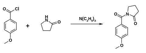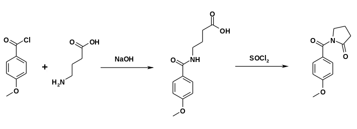 Alternatively, gamma-aminobutyric acid can react with anisoyl chloride. Ring closure can be accomplished in the presence of thionyl chloride.[12]