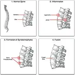 Prognosis is related to disease severity.[10] AS can range from mild to progressively debilitating and from medically controlled to refractory. Some cases may have times of active inflammation followed by times of remission resulting in minimal disability while others never have times of remission and have acute inflammation and pain, leading to significant disability.[10] As the disease progresses, it can cause the vertebrae and the lumbosacral joint to ossify, resulting in the fusion of the spine.[44] This places the spine in a vulnerable state because it becomes one bone, which causes it to lose its range of motion as well as putting it at risk for spinal fractures. This not only limits mobility but reduces the affected person's quality of life. Complete fusion of the spine can lead to a reduced range of motion and increased pain, as well as total joint destruction which could lead to a joint replacement.[45]