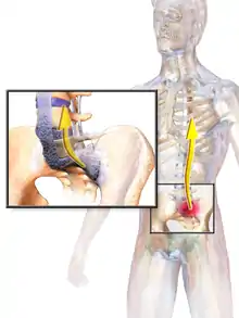 AS can occur in any part of the spine or the entire spine, often with pain referred to one or the other buttock or the back of the thigh from the sacroiliac joint. Arthritis in the hips and shoulders may also occur. When the condition presents before the age of 18, it is more likely to cause pain and swelling of large lower limb joints, such as the knees.[12] In prepubescent cases, pain and swelling may also manifest in the ankles and feet where heel pain and enthesopathy commonly develop.[12] Less commonly ectasia of the sacral nerve root sheaths may occur.[13]