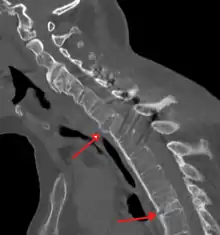 Osteoporosis is common in ankylosing spondylitis, both from chronic systemic inflammation and decreased mobility resulting from AS. Over a long-term period, osteopenia or osteoporosis of the AP spine may occur, causing eventual compression fractures and a back "hump".[46] Hyperkyphosis from ankylosing spondylitis can also lead to impairment in mobility and balance, as well as impaired peripheral vision, which increases the risk of falls which can cause fracture of already-fragile vertebrae.[46] Typical signs of progressed AS are the visible formation of syndesmophytes on X-rays and abnormal bone outgrowths similar to osteophytes affecting the spine. In compression fractures of the vertebrae, paresthesia is a complication due to the inflammation of the tissue surrounding nerves.