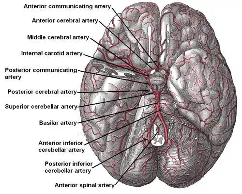 ![]() The cerebral arterial circle and arteries of the brain. The anterior communicating arteries (top of figure) connect the left and right anterior cerebral arteries. | |