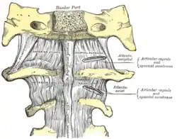 ![]() Anterior atlantoöccipital membrane and atlantoaxial ligament. (Anterior longitudinal ligament runs vertically at bottom center.) | |